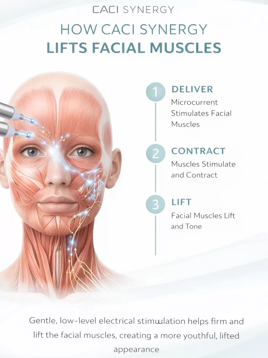 CACI Synergy is an advanced facial rejuvenation system that combines dual-action microcurrent technology with LED light therapy to deliver enhanced lifting, toning, and skin-renewal benefits. The treatment uses synchronized microcurrent impulses to stimulate and re-educate facial muscles, helping to restore firmness and improve structural support. LED technology works simultaneously to promote skin regeneration, improve texture, and enhance overall luminosity.
